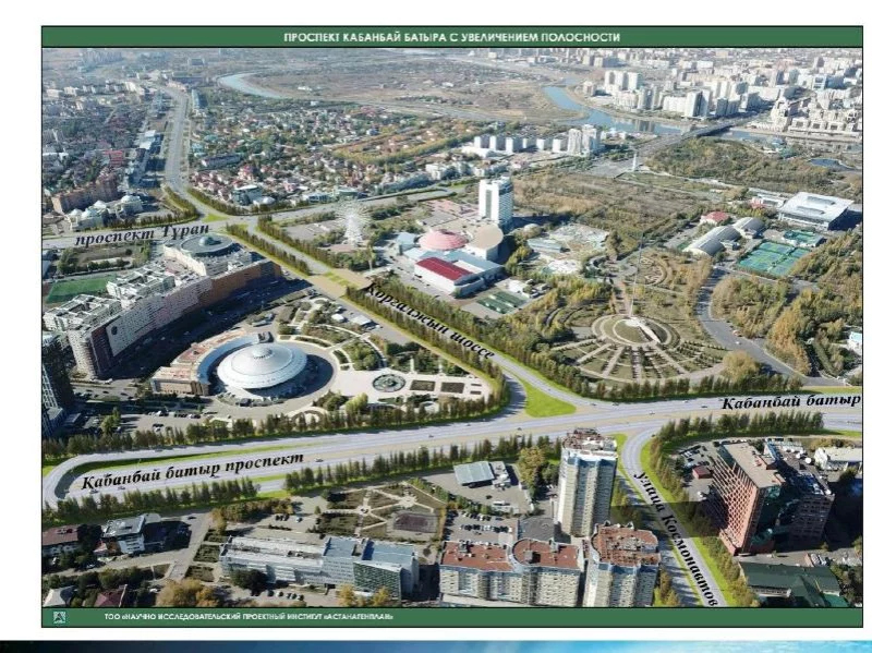 Проектом предусмотрено расширение проспекта Кабанбай батыра на участке от дворца «Салтанат Сарайы» до международного аэропорта имени Нурсултана Назарбаева до 6-8 полос общей протяженностью 17,353 километра.