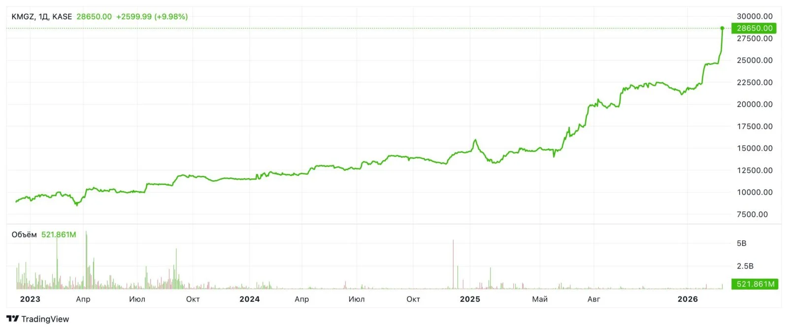 Акции АО «КазМунайГаз» (тикер KMGZ) в ходе торгов на Казахстанской фондовой бирже резко выросли почти на 10% и в моменте достигли нового исторического максимума – 28644 тенге за бумагу, сообщает Exclusive.kz.