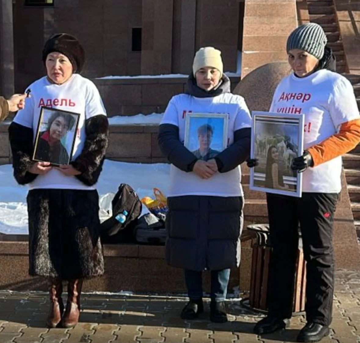 Женщины держали портреты погибших детей. Среди них – школьница Адель Аканова, найденная повешенной во дворе своего дома в Алматы. Мать Айнагуль Беисова уверена, что дочь была убита.