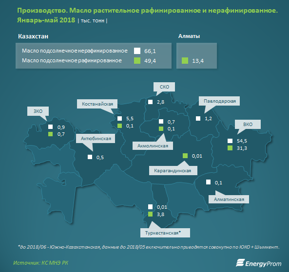 В ВКО работают такие крупные предприятия отрасли, как, например, АО «Май», ТОО «Востоксельхозпродукт», ТОО «Усть-Каменогорский Маслозавод». В Алматы среди ведущих компаний отрасли — АО «Евразиан Фудс Корпорейшн», алматинский филиал ТОО «Масло-Дел», ТОО «MS», ТОО «ЭФКО Алматы». В Туркестанской области известны АО «ШымкентМай», ТОО «Арай» и т.д.